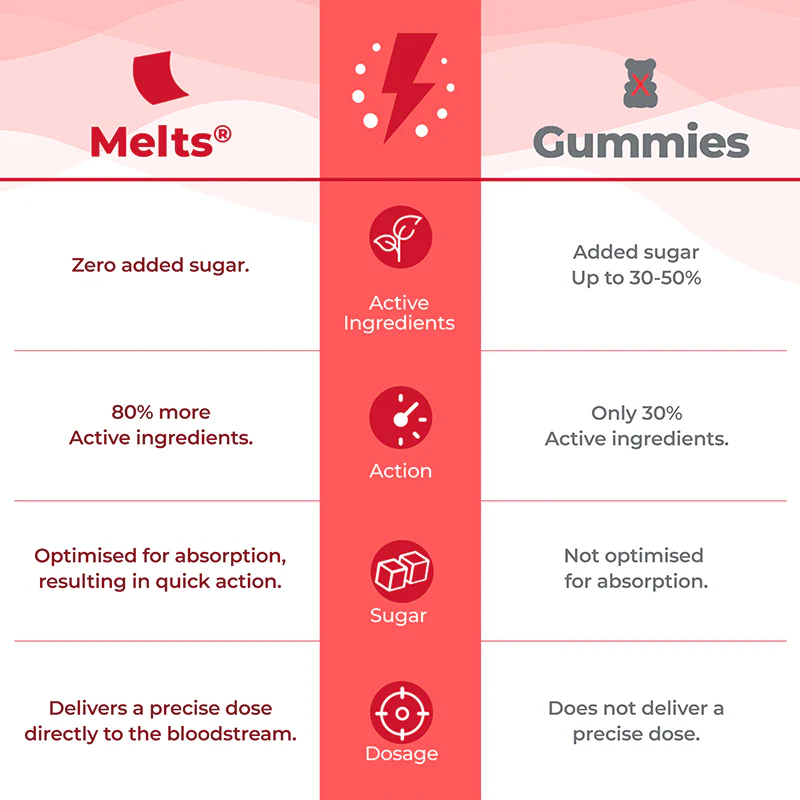 melts® zijn snel oplossende nanostrips die belangrijke plantenextracten omzetten in nanodeeltjes. Deze strips ‘smelten’ zodra ze in contact komen met je tong voor een gemakkelijke en volledige opname van al het goede en voedingsstoffen op een uiterst plezierige manier.