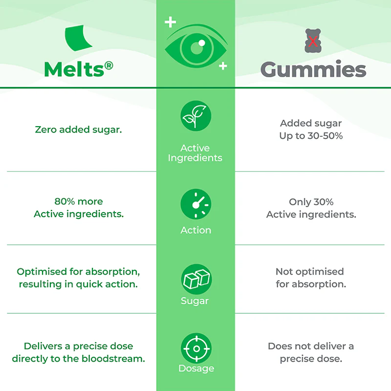 Zit je de hele dag voor een scherm? Zelfs je pauzes bestaan uit Netflix zonder afkoeling? Dan is het tijd om melts®️ Eye Care te proberen – een kleine strip die je oplost in je mond en van binnenuit werkt om je ogen te beschermen tegen vermoeidheid en digitale belasting!