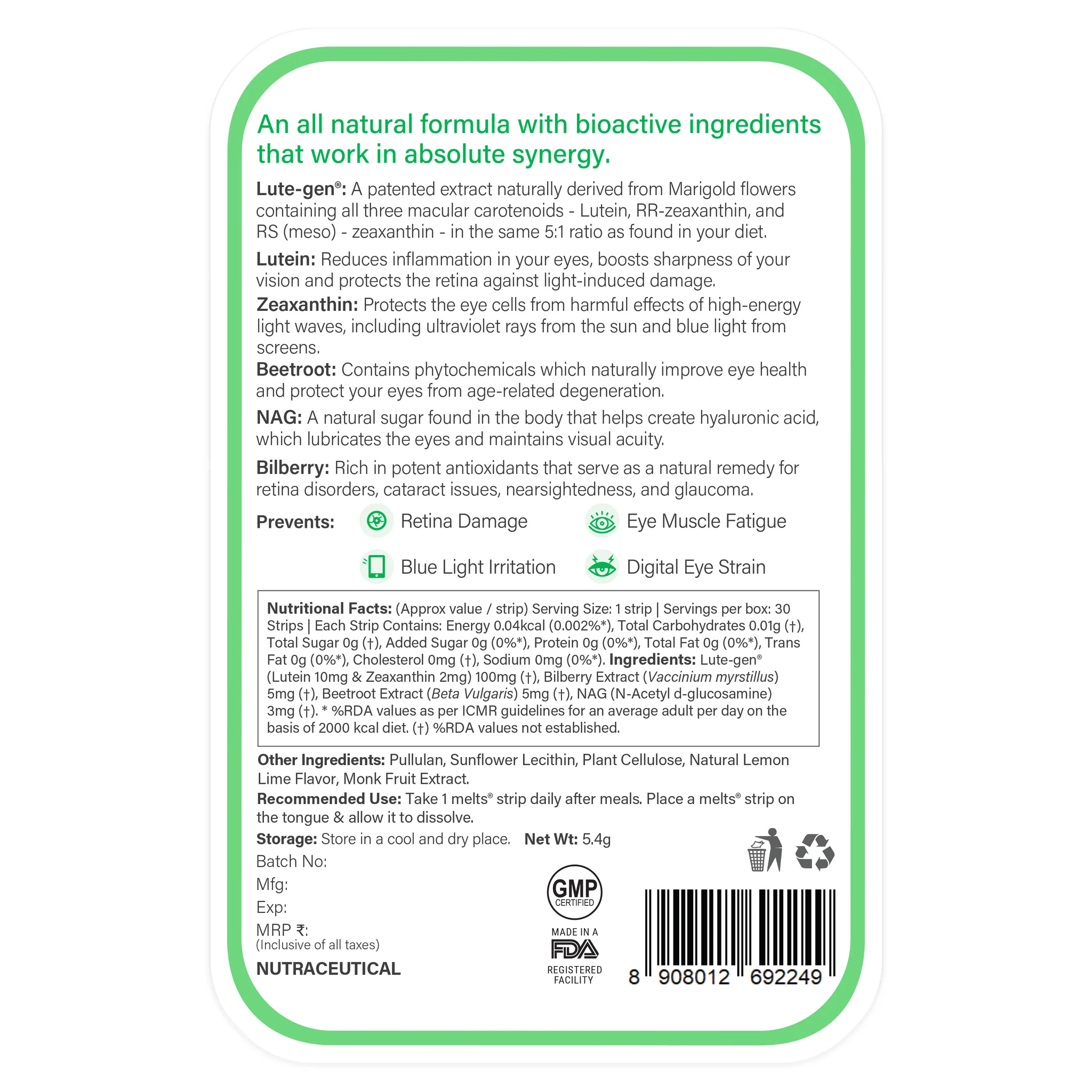 Natuurlijk gewonnen Lute-gen® 2020 met Luteïne en Zeaxanthine voor een sterker gezichtsvermogen en gezondere ogen.
