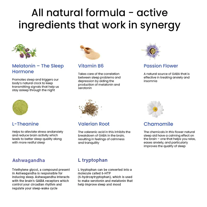 100% plantaardige melatonine (10 mg) in combinatie met valeriaanwortel en L-theanine kalmeert je zenuwen, verlicht slapeloosheid, helpt je elke nacht diep te slapen en helpt het natuurlijke proces van je lichaam om in slaap te vallen.