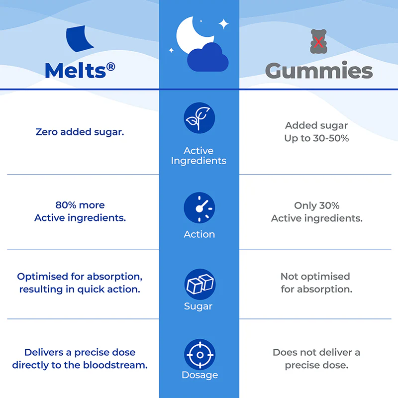 Heb je moeite om in slaap te vallen? Lukt het je niet om acht uur diep te slapen? Word je moe wakker en voel je je de hele dag futloos? Niet meer. melts®️ Restful Sleep is alles wat je nodig hebt voor een goede nachtrust!